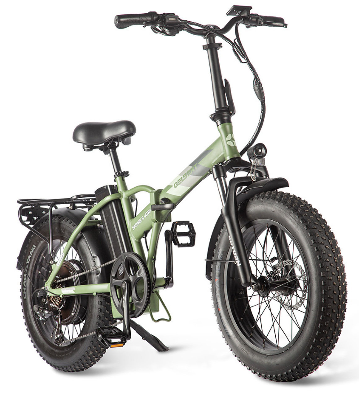 Saturn 5 Ultra (2025) - мощный складной электро-велосипед от компании Gelbert для универсального передвижения по разным типам покрытия. В своей основе имеет алюминиевую раму, с улучшенной системой складывания рулевой колонки и самой рамы. Для комфортного передвижения по любому типу дорожного покрытия имеется амортизационная вилка ходом 40 мм, с блокировкой, а также 20-ти дюймовые покрышки шириной в 4 дюйма, для большего пятна контакта с дорогой. Модель оборудована электромотором на заднем колесе, мощностью в 1000 Вт и съемным аккумулятором в 16.7 Ач (напряжение аккумулятора 48 В), что позволяет достигать максимальной скорости в 25 км/ч и максимального пробега до 50 км. Велосипед оборудован 7 скоростной трансмиссией от компании Shimano, для облегчения преодоления подъемов. Управлять мощностью мотора, а также контролировать показатели поездки удобно при помощи информационного LCD дисплея, расположенного на руле. За безопасную и контролируемую остановку отвечают дисковые механические тормоза. Для повышения уровня комфорта Saturn 5 Ultra, в комплектацию велосипеда входят широкие полноразмерные крылья, подножка, мягкое комфортное сидение, а также удлиненный багажник с крепким фиксатором.